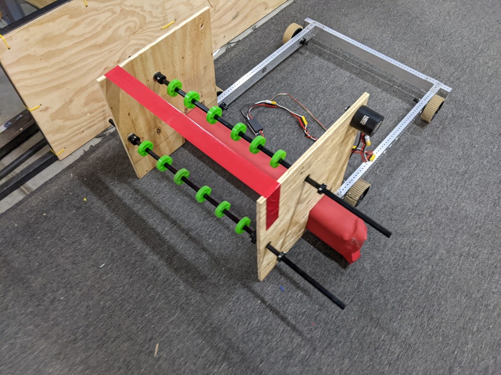 As you can see in the above gif the compliant wheels might be just a tad bit too squishy. The cargo bounce in and out between the rollers before finally catching. We changed out the rollers to blue compliant wheels and will test again on Saturday. There is a small dead spot in the intake that we will iterate on to remove. Also a fun note, when using west cost products belt calculator the default pitch is 3mm not 5mm. All of our center to center calculations for the prototype where wrong.