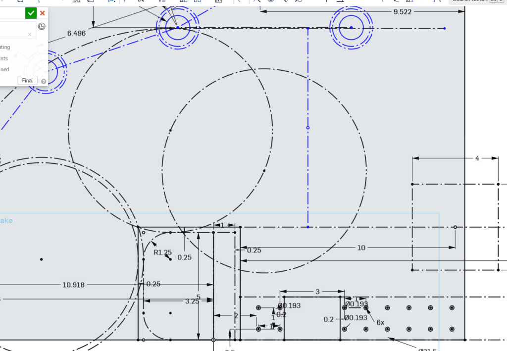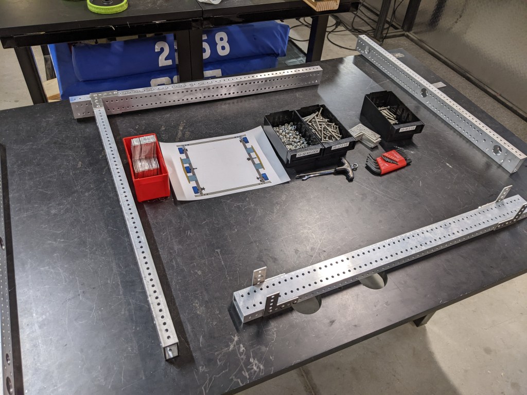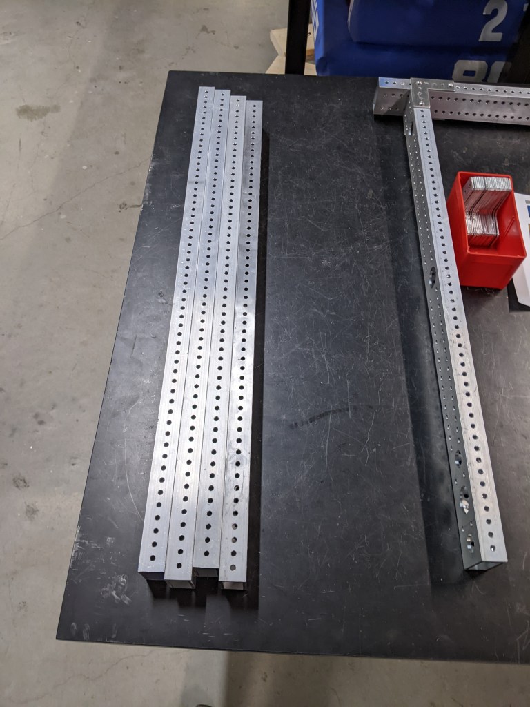The drive base rails all got finished, 8 rails, a bunch of holes made in two days. It was a good turn around from the manufacturing students. We decided to put a hole pattern on the sides of the rail this year. That was mostly inspired from our experience in 2020 where we had to take apart the drive base a few different times to add holes. Its not fun taking things apart to add a few holes. Its a compromise too, If we could finish CAD quick enough and hand off the robot in one piece to manufacturing we wouldn’t need to add all the holes. But if we tried to do that they would get a robot sometime around week 5 and no one would be happy. So we make the trade off of drilling a few extra holes.