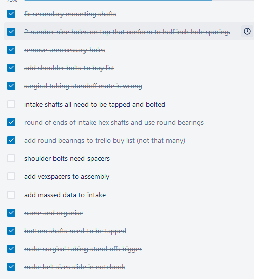 Today we had the design review for the intake subsystem. We came out of the design review with quite the list of changes needing to be made. Most of the changes are small and don’t really require any major redesign.