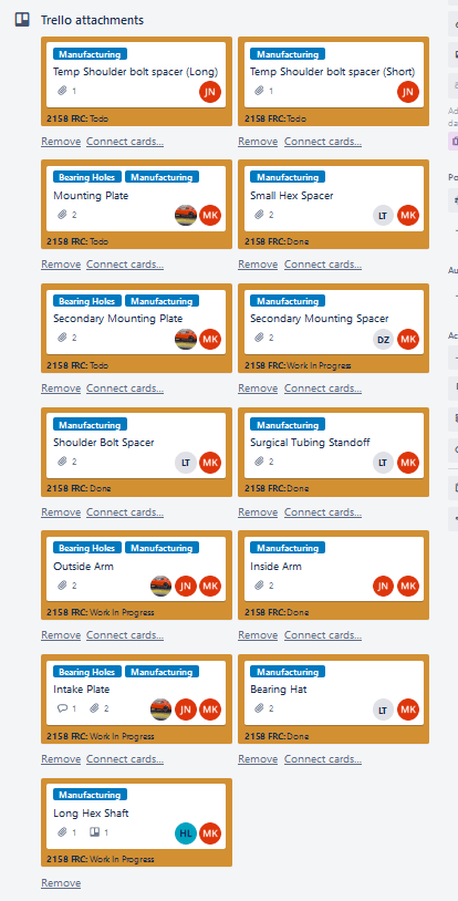 Today felt like the opposite of yesterday, progress was being made through out the entire meeting. At the start of the meeting I talked with the manufacturing student lead to set the priority for the rest of the meeting. The number one priority right now for manufacturing is finishing the parts required for the intake. Its the subsystem that is the closest to being done and requires the least amount of other stuff on the robot to test. With that manufacturing set off to work to produce the required parts. I created a Trello card to assemble the intake and linked every part required to that card.