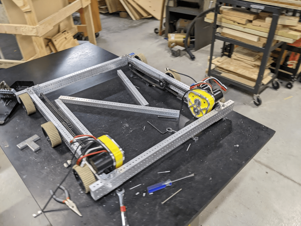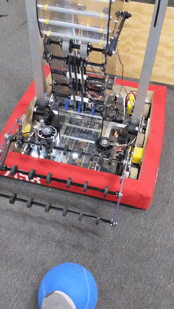 Today, a few students, before the meeting started swapped around the intake rollers, they put the stiffer wheels on the back bar. They also took this opportunity to flip the bearings and add more wheels. We are trying to eliminate a dead zone between one of our vertical rollers and the side of the intake. We saw this dead zone with the MDF bot but managed to eliminate it with more wheels it that spot. It didn’t work for us on the real robot. It might be the lower speed the vertical wheels are running, on the MDF bot it was a Neo with a belt reduction, we now have a 20:1 ultra planetary with a Neo 550, so significantly slower.