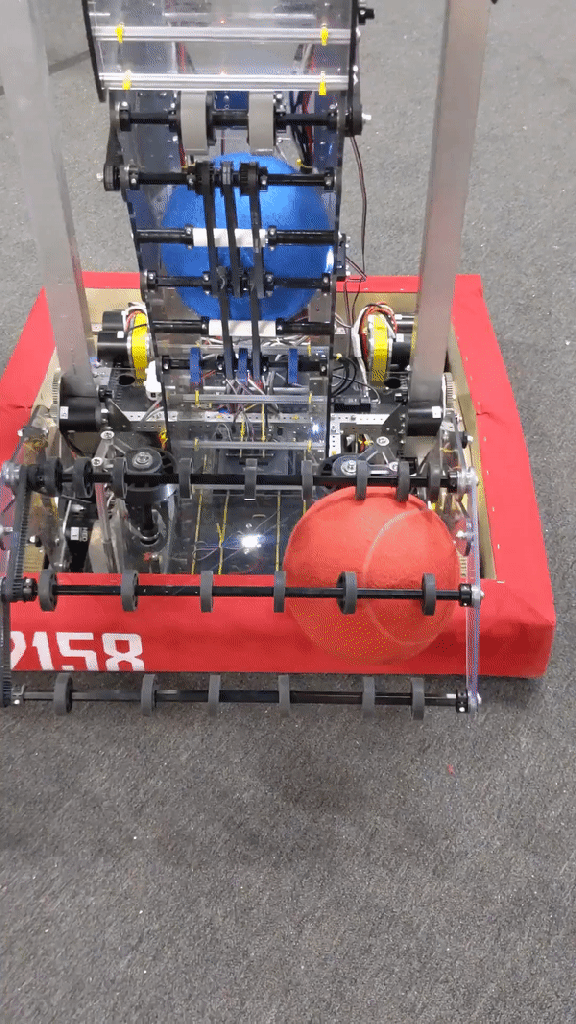 Today the robot was mostly reserved for programming. But first we changed the ultra planetary gearboxes on the singulator to a lower reduction(I think 5:1, used to be 20:1). This has eliminated most dead zones(we only saw 1 in an hour of driving practice). The cargo starts in the previous dead zone and doesn’t get stuck. We also added some quick hard stops to the intake to prevent the plates from sliding past each other. When the intake plates fell past each other the rollers were no longer at the correct height to intake the ball against the bumper.