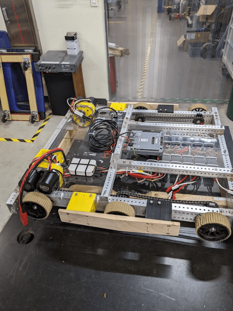 They also spent a bit of time testing PID control on the climber. We didn’t get very much progress on this front, and we had to stop early as we are constrained on by robot testing time at the moment. It would be really nice if our second robot was up and running right now. The second robot’s electrical panel got a great start to it today. All of the important hardware was mounted, and the majority of the power distribution wires were added. The drive motors got fully wired up too.