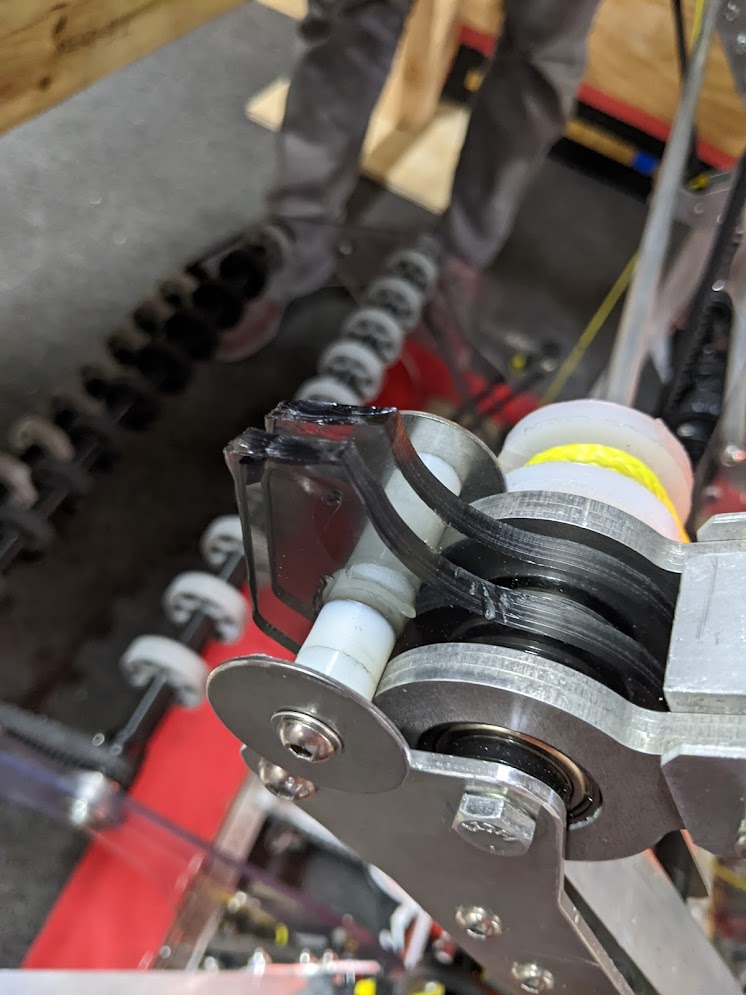 Bonus problem, the poly carbonate bracket the holds the passive hooks started to develop stress fractures. Another mentor did some FEA after the meeting, the poly carbonate bracket had a safety factor of 1.3, and when we impacted our poorly setup hanger replica(we had the wall way to close to the traversal run, and created a problem for ourselves, hitting the backing) we exceeded the limits of the poly carbonate bracket and it started to slowly fail. We are remaking the bracket in aluminum and it now has a safety factor of 8.
