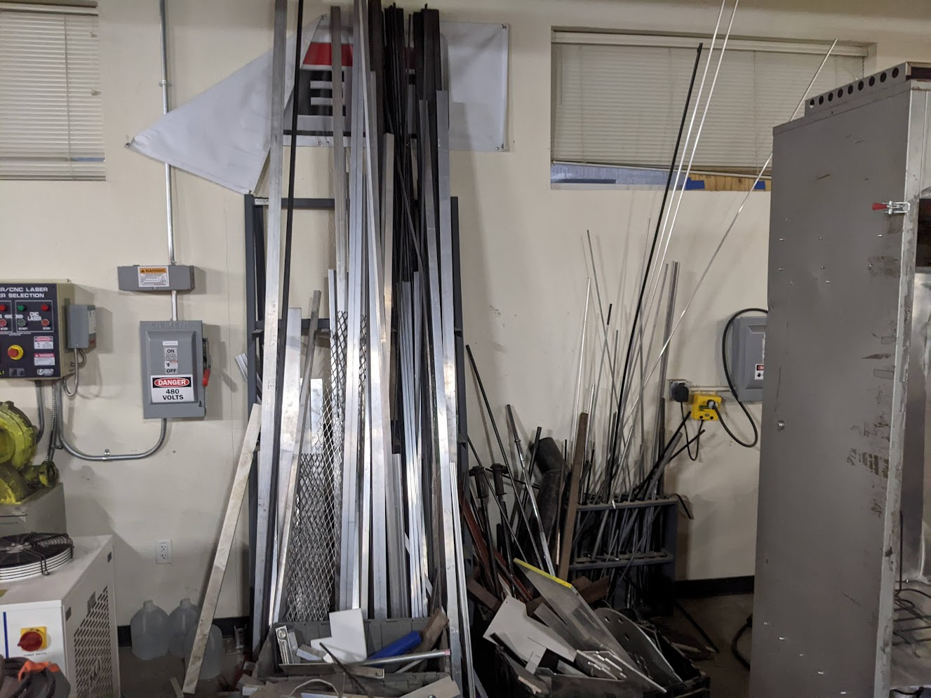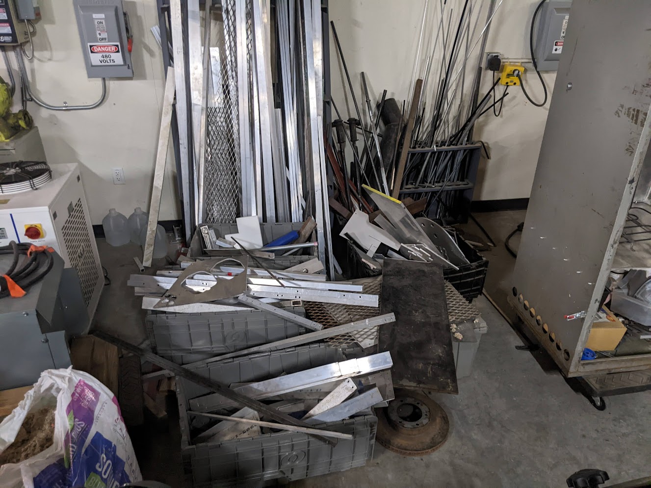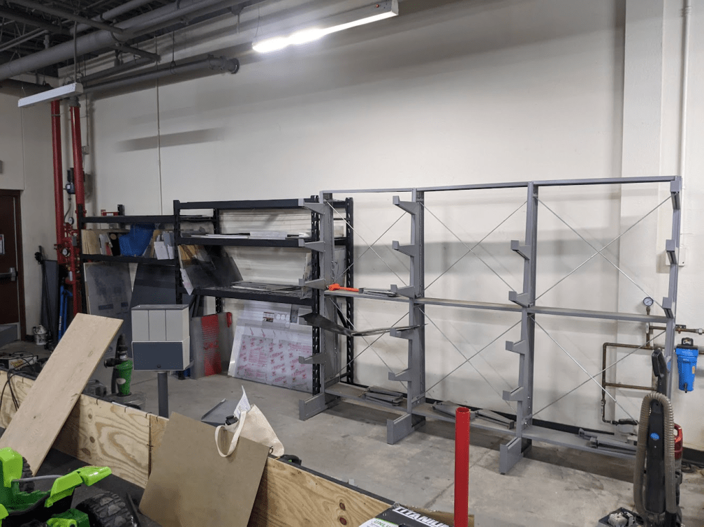 The goal is to move all of the smaller pieces of metal stock to the metal shelf next to the plastic storage(right on the first picture), and then use the standing rack to hold all full length metal pieces. Then we need to sort out the scrap bin(and recycle most of it), fix the metal plate storage, and finally make the shaft storage(the thing on the right in the above photos) useful and easy to store all lengths of shafts. Currently if the shaft is too small it won’t fit and it will fall out of the rack, on the other hand if the shaft is too long the rack doesn’t offer enough support and the material just hangs over and bends. The current shaft rack doesn’t really meet our needs.