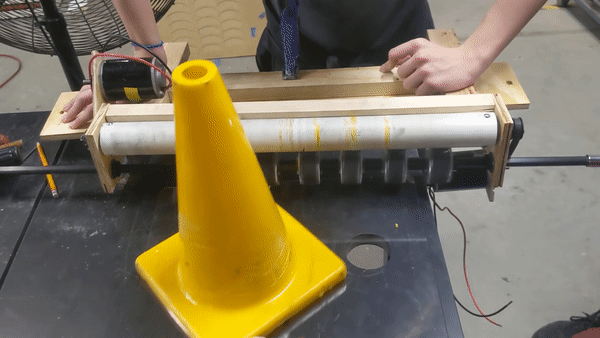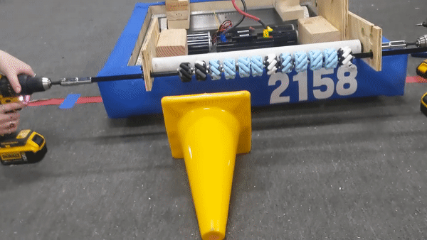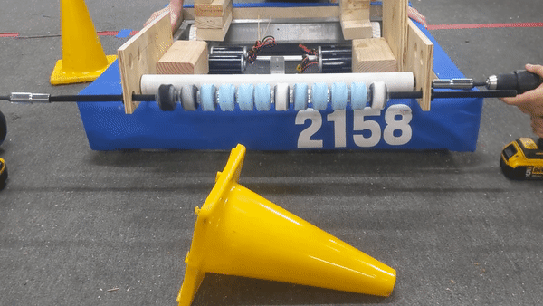 With our schedule cleared up the prototyping group continued to test vectored intake wheels. They increased the number of vectored intake wheels on the front shaft. This improved the prototype significantly. It was able to some times center the cone now. The position of the back roller still causes too much friction sometimes and the cone will get stuck.