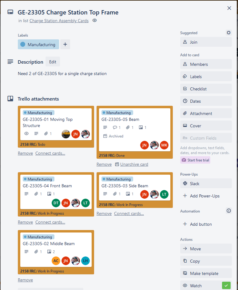 We completed an audit of the charge station parts list, we found a few pieces that are missing from our manufacturing process. A completed charge station is at best a week out still. At some point I’ll write down how we use Trello to track/handle our part workflow. Until then, this picture will have to hold you over.