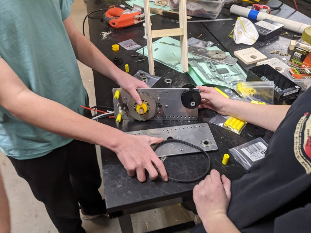 The CNC laser made it’s first robot parts today. The arm gear box plates where both cut out. Gears in our shop were mislabeled with the wrong tooth count. That became a problem when we put it all together. Fortunately we managed to find a combination of gears that we had on hand and will still work with the current gearbox plate.