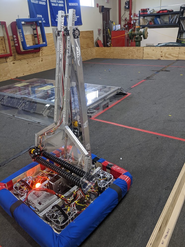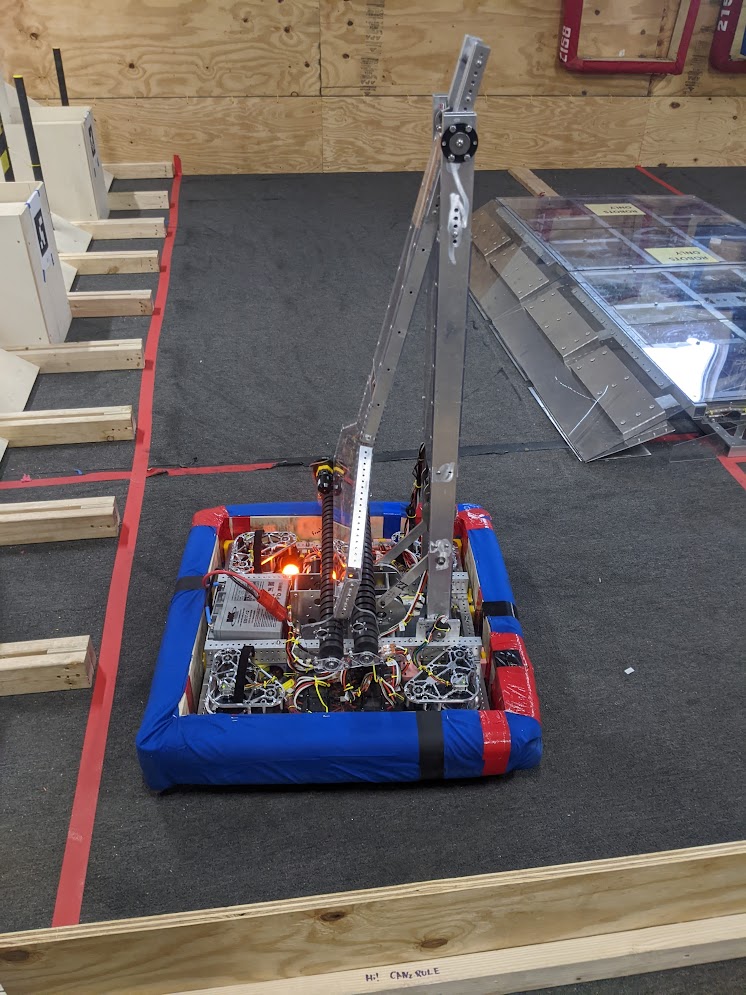 After assembly the first thing we did was head over to the scale, the robot with the arm and intake weighs in at 79.4 lbs. Plenty of weight left for the buddy carry. After the scale we turned the robot over to programming to start testing their code.