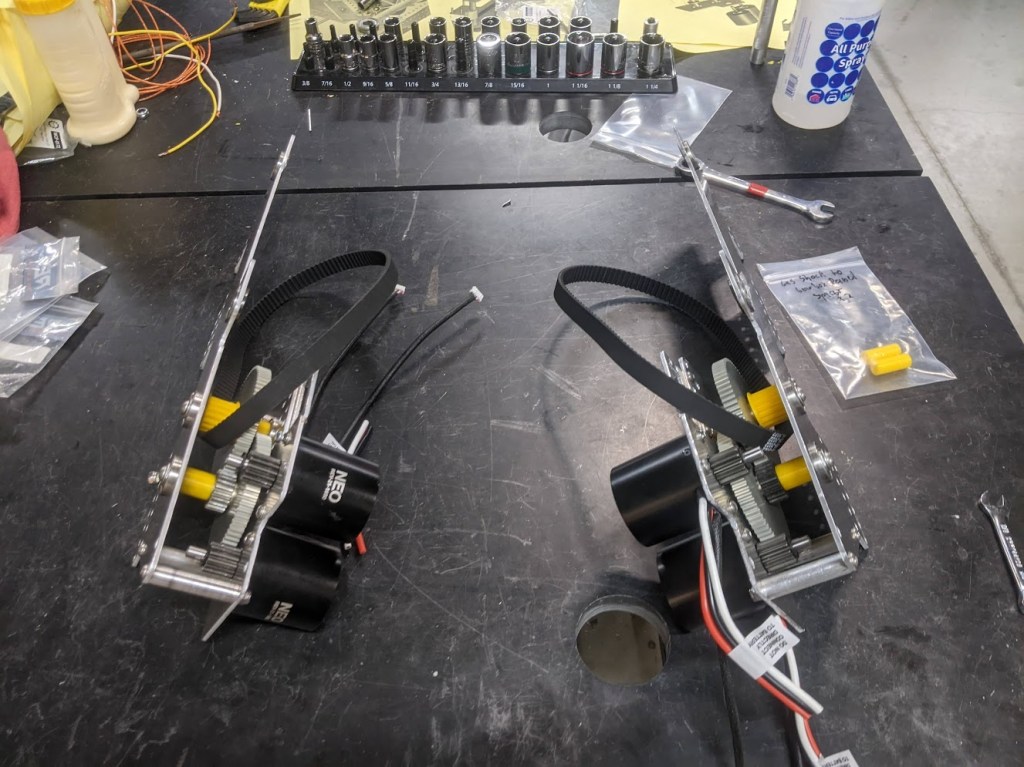 While the arm was being worked on the buddy carry gearboxes were also being assembled. We are missing some metal double wide pulleys so we used 3D printed ones for initial assembly. 3D printed pulleys are great for low torque applications, but our buddy carry doesn’t exactly fit that, we’ll end up replacing these when the metal ones get in.