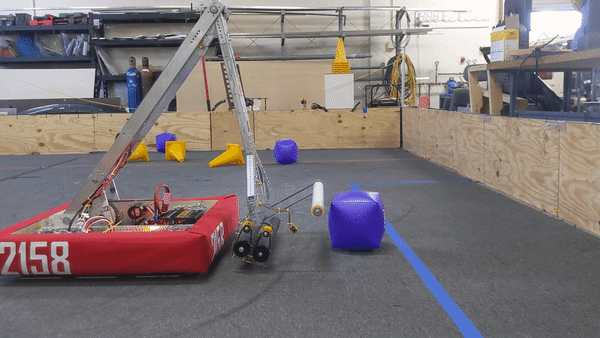 The next iteration of intake went on the robot today. There was a clearance issue with the motor and the sweeper plate that had to get fixed by hand but everything else fit together. Below are two gifs, our first time intaking a cube and the first time scoring it into a high node.
